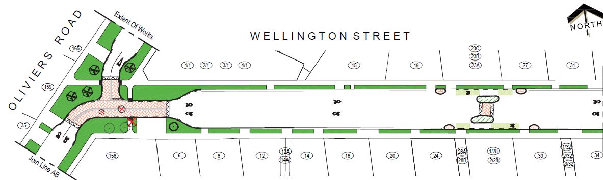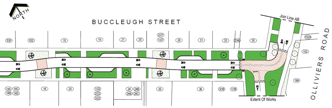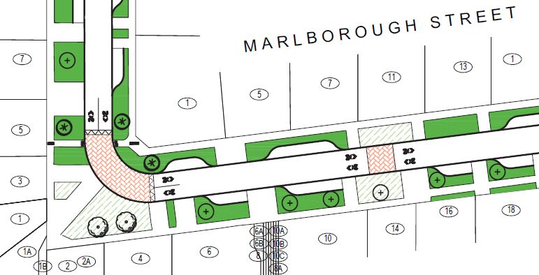 The traffic calming devices being proposed in the “untreated kerbs” option are the same as the ones being used elsewhere along the route, such as Worcester St, with cycle bypasses around the central narrow point. It still leaves fairly long straight road sections, and I wonder whether some occasional planted central islands would help to break up the sight lines and slow down traffic further.