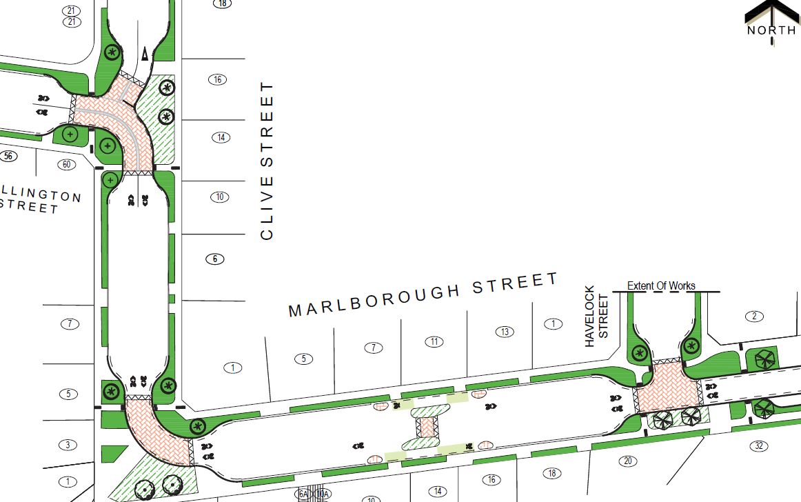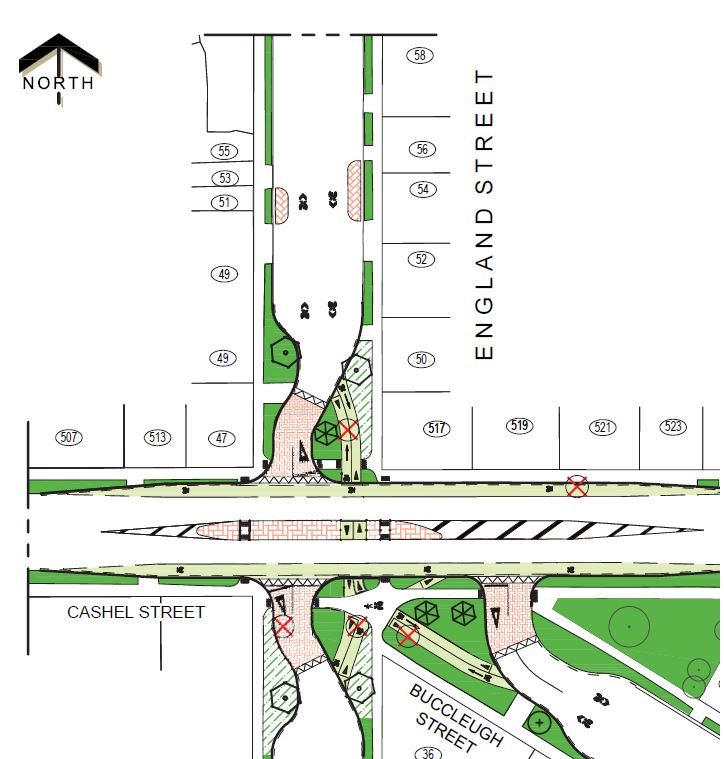 Starting at England St, the new route now crosses over Cashel St and connects to Buccleugh St via an off-road cycle path. Along the new route, two options for the street layouts are being considered: (1) full street reconstruction with narrowed kerbs and indented parking, or (2) using the existing kerb lines, with regular traffic calming devices installed. Not surprisingly, the former option is more expensive (and currently unbudgeted for), but would produce a nicer result (and is probably more effective).