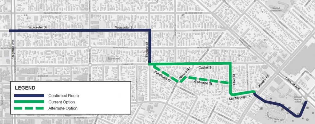 One of the biggest concerns with the original Rapanui Cycleway route was with the removal of car parking along Cashel St; a number of flats along there have very little off-street parking. So an alternative possible route was identified along adjacent streets that avoids this problem (and actually saves 80m in distance too). Public consultation is currently being sought on this option.