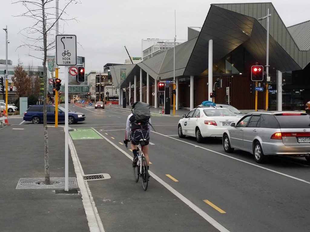 While these are a handy addition to our network, it’s important to remember that you can actually make a hook turn manoeuvre anywhere; you don’t need a special box or a sign to legally do a hook turn. Just be careful with some of the one-way streets that you don’t get caught out trying to do a hook turn in a place where you can’t see any traffic signals, e.g. trying to turn north from Bealey Ave onto Barbadoes St here.