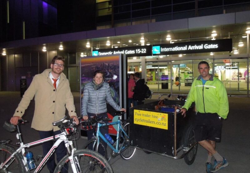 Dutch cycling ambassadors Marjam and Edward arrived at Christchurch Airport Wednesday night to see how we are going on our cycleway building. Cycling ambassadors of course love to travel by bike and so I (Steven Muir) revamped my ‘clean green limousine’ and picked them (and their luggage) up using my cargo bike. Because the airport is a reasonable distance (12km) and the cargo bike is built for strength not speed and I’m on the tail end of a cold & lacking in energy, I decided to add on my new addition to my bike trailer fleet – an electric assist trailer with 300W motor in the back left wheel powered by a lithium ion battery (tucked in the trailer) with the additional advantage of 98 litres of spare luggage space.