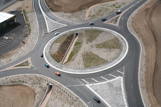 - Finally we get to the new southern access that links into the Dakota Park airport business area. On-road shoulders in all directions coupled with the underpass ensure that someone cycling can get to/from any direction. But it does seem a bit convoluted to have to travel ~600m around a loop if coming from the north – surely it would be easier for a bike to connect to the adjacent service road?