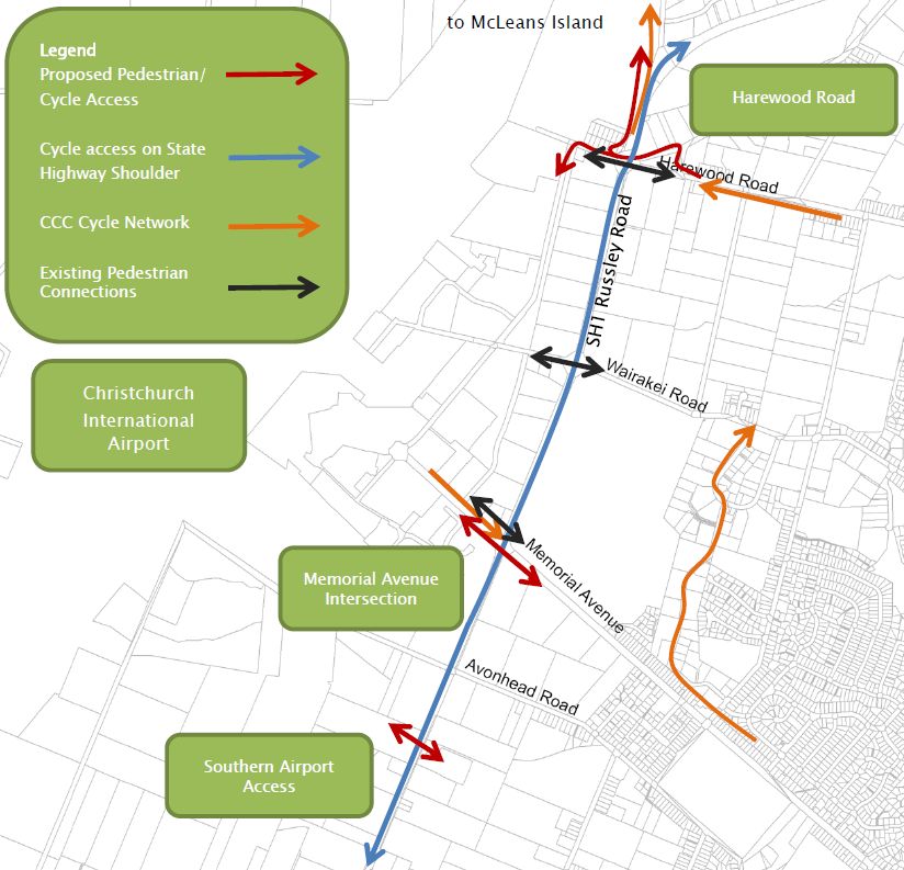 - So what’s in it for cycling? The key things identified are 2.5m shoulders along the whole highway route, on-road links via the southern access interchange and Memorial Ave intersection, and an underpass spanning the Harewood roundabout.