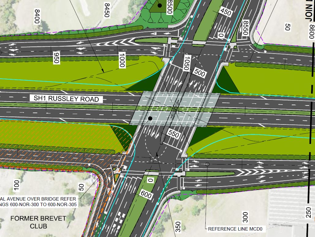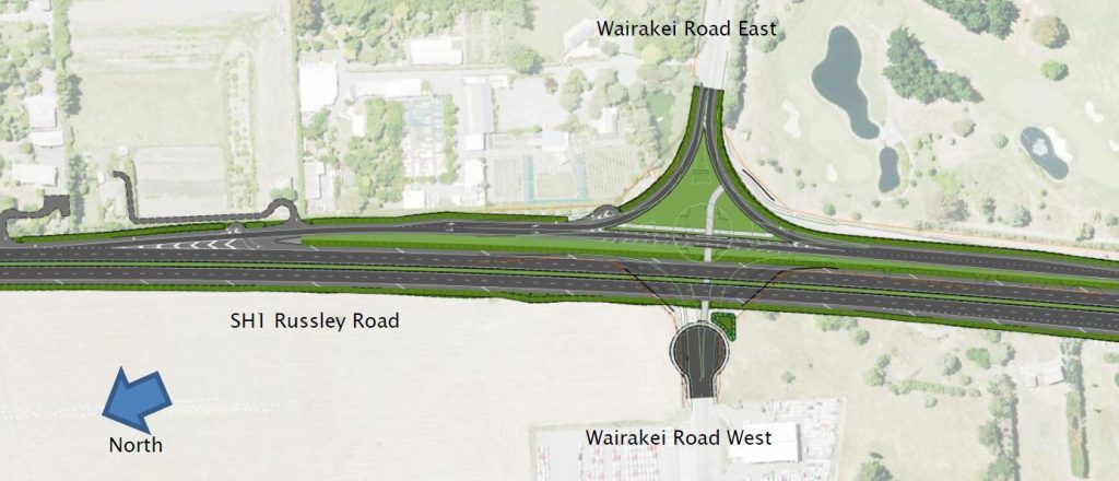 - Further south, one of the more contentious project decisions has been the restricted access to Wairakei Rd. It has been increased from the original design, but it still won’t be possible to cross over to the airport from here (although there is an emergency access path shown on the plan). Southbound cyclists will be able to enter or exit Wairakei Rd here, but there’s no option for northbound riders (or indeed any northbound traffic). By the way, this is also where you exit the highway if you want to access Memorial Ave from the north.