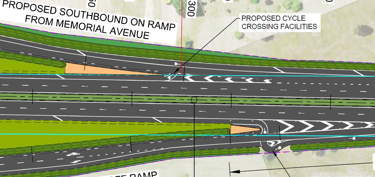 - At Memorial Ave, the existing roundabout will be replaced with a new “feature” flyover and traffic signals. This certainly represents an improvement over trying to run the gauntlet at the current intersection, with cycle lanes and hook turn boxes provided. Nevertheless, it will still be a somewhat daunting intersection, with up to four approach lanes of traffic right next to you.