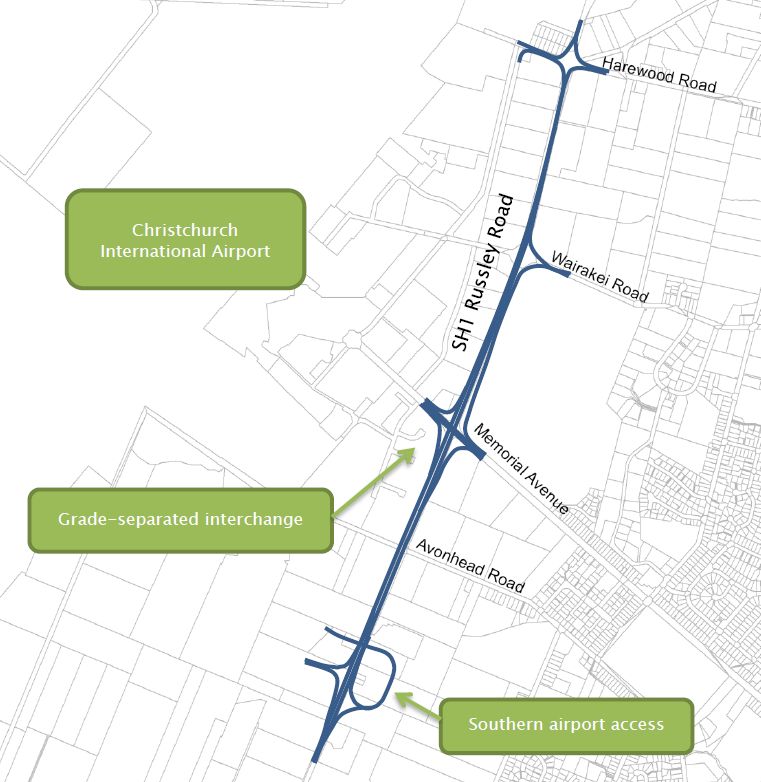 - First a quick run-down of what is intended: “Application (1 of 5)” (11MB) gives a very detailed overview of the whole project (or check out “RFI response 4” for just the current plans; 6MB). Alternatively, you might like to have a look at NZTA’s website for this project; definitely more user-friendly. Essentially the project involves four-laning this section of highway, with an upgraded roundabout at Harewood Rd, limited access at Wairakei Rd, a flyover with traffic signals underneath at Memorial Ave, closing off Avonhead Rd access, and a new southern airport access with an underpass.