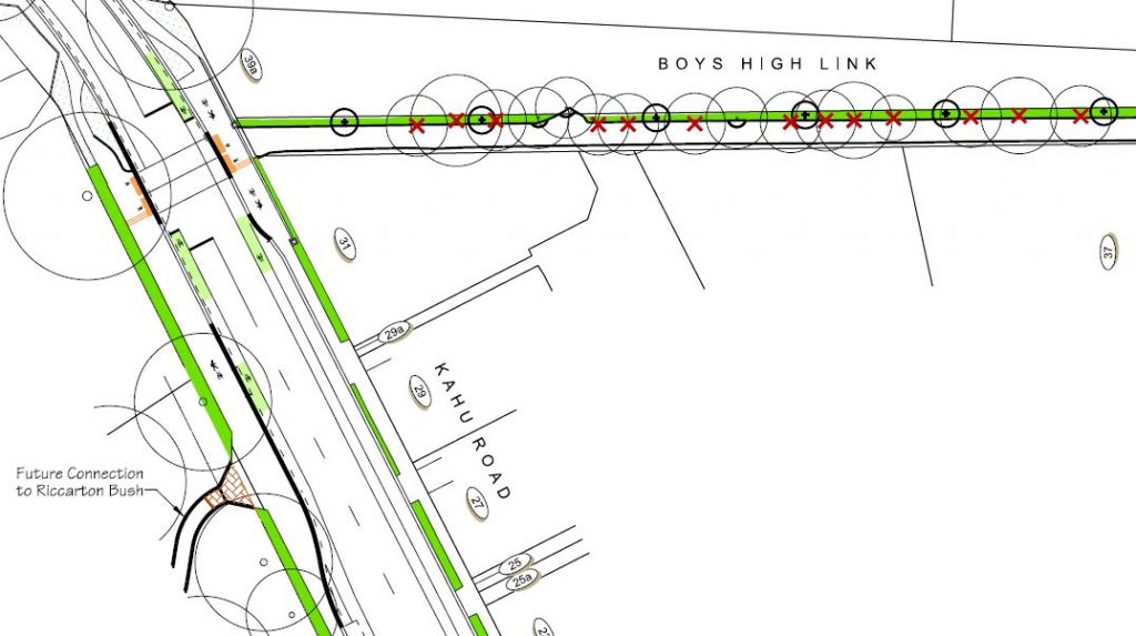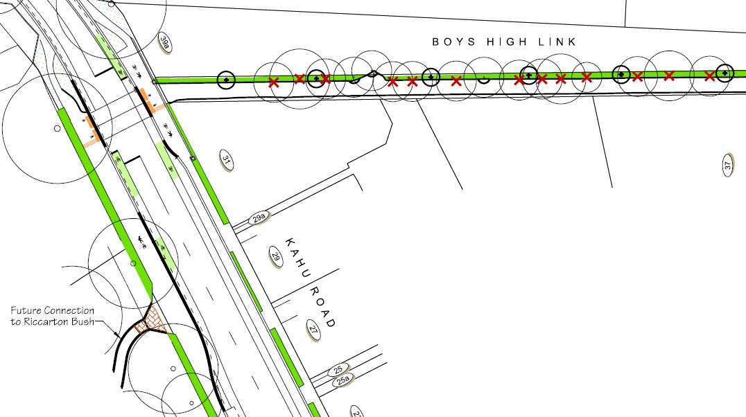 • Meanwhile, west of Matai St, the existing pathway past Boys High to Kahu Rd will be widened and also lit at night. Unfortunately, retaining some trees along here will limit the extent of the widening to only 3m, still a good improvement on the existing state.