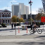 At Bealey Ave a separated signal phase will get cyclists across the main road before turning traffic gets to go. I do wonder why through-traffic on Colombo isn’t blocked at the intersection, as is being done at Worcester/Fitzgerald on the Rapanui – Shag Rock cycleway (it would require relocating the bus route to a parallel street though). Once over the Bealey Ave intersection, the route becomes part of the Accessible City Plan being delivered separately.