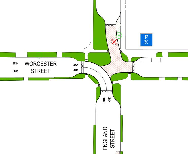 The most annoying aspect is that the proposal to provide a quieter cycling route by cutting Worcester St in half at England St has been removed, due to some concerns by businesses that this would badly affect them – given that there are parallel routes either side of Worcester only 100m away with regular cross-roads, I fail to see how this will be the case. So we will have to see whether the new neighbourhood greenway through here is sufficiently cycle-friendly for the “interested but concerned”.