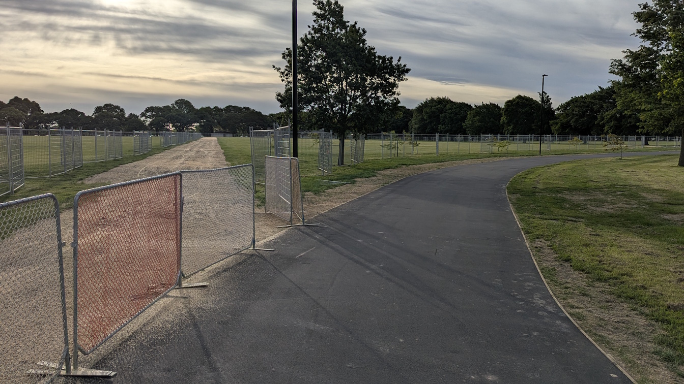 The new pathway, which appears to be about 3-4m wide, heads north to run alongside the row of trees subdividing the playing areas.