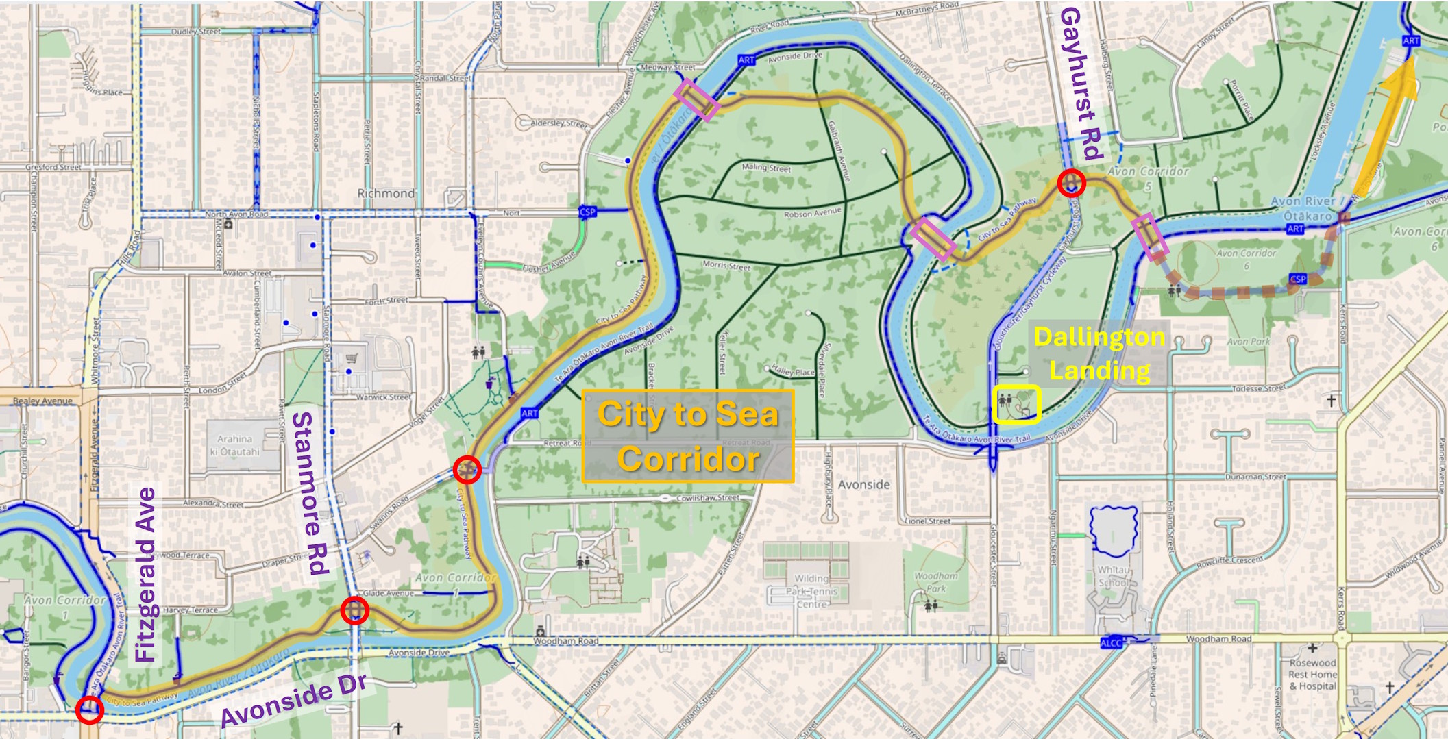 The route of the first part of the shared pathway to Avon Park (road crossings in red and bridges in pink)