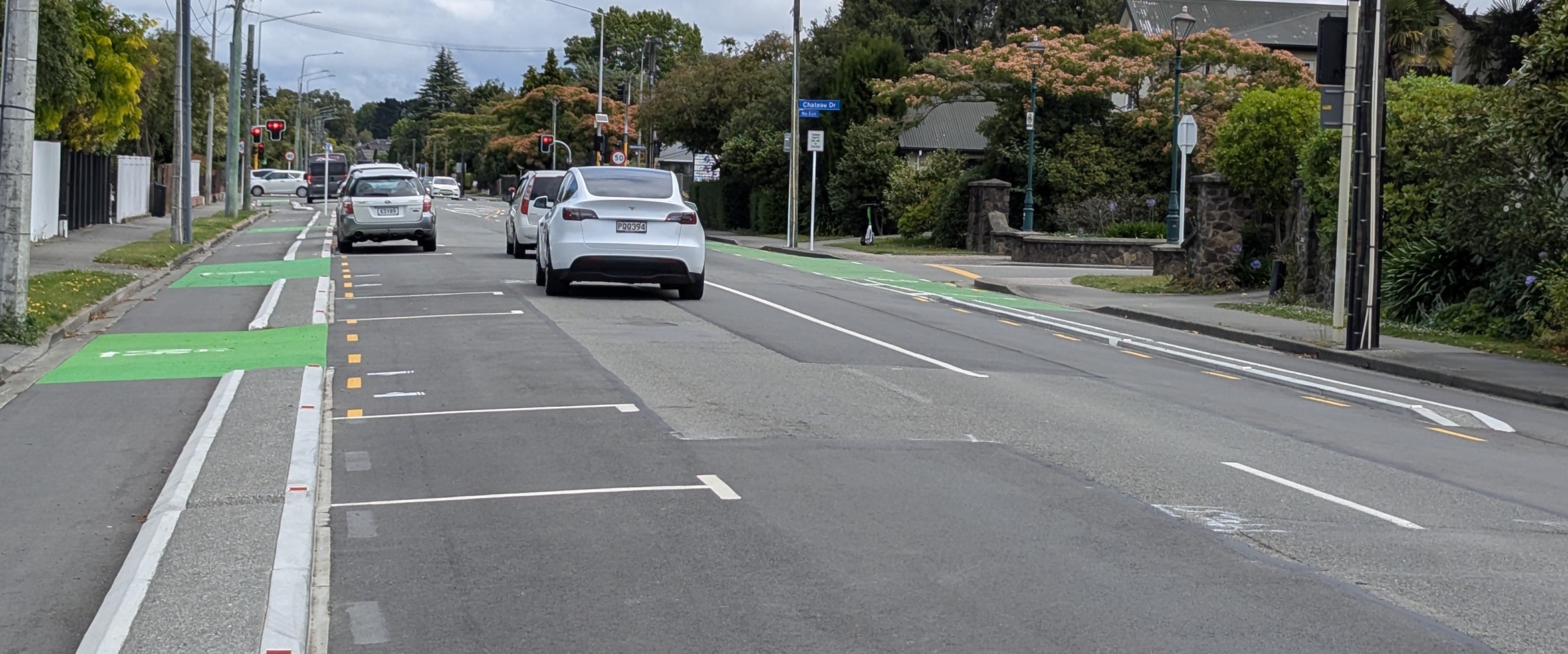 Approaching Wairakei Rd, things get interesting as a signalised crossing provides a safe way for cyclists and pedestrians to get across this busy road.