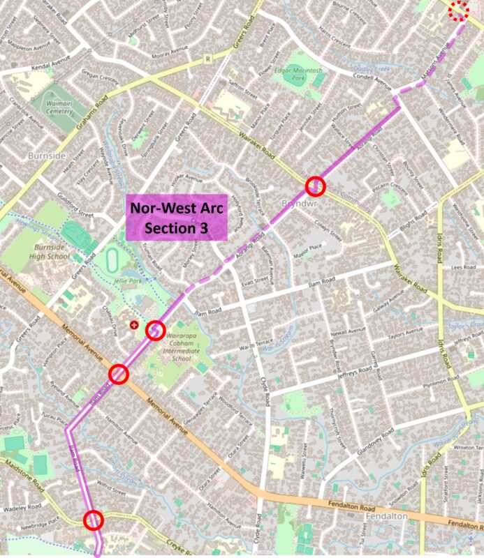First consulted on back in 2017, the overall Nor’West Arc route actually stretches all the way from Cashmere in the south, through Hoon Hay, Hillmorton, Middleton and Riccarton, before continuing north via Ilam and Bryndwr until it reaches Harewood Rd in Papanui. The northernmost section (“Section 3”) was actually consulted on over four years ago, but construction is still only partially complete.