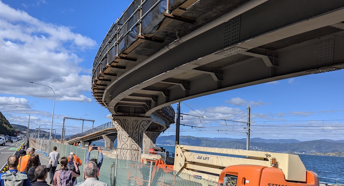 The project is hopefully only weeks away from being officially opened, but we got a sneak preview of where it’s at for now. They are just putting the finishing touches on the walk/cycle overbridge at the southern end, which takes the pathway from the seaward side over the railway corridor to connect with the Hutt Road pathway.